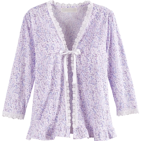 You’ll keep comfyin this breathable jersey knit bed jacket. It features a blend of cotton and modal that feels so incredibly soft and silky, you might just wear this bed jacket tosleep, too. It has a beautiful lavender floraldesign and is finished with medallion lace trim along with the open V-neck style. It also has a pretty satin ribbon tie closure and a soft ruffled hem. It pairs perfectly with the matching nightgown. Runs small, order accordingly.