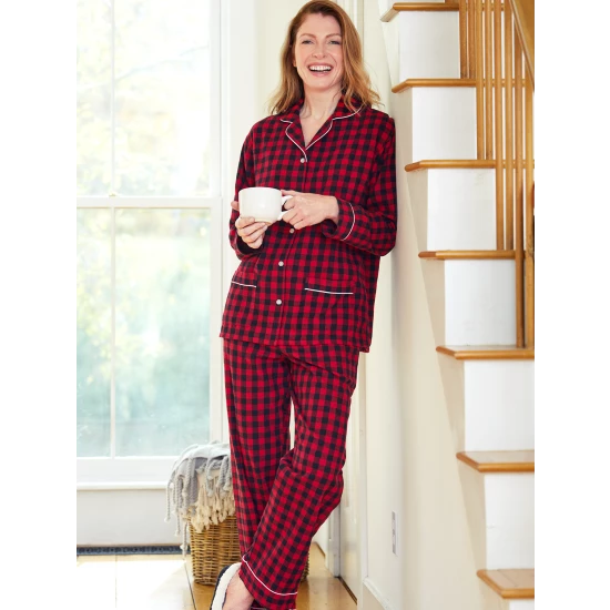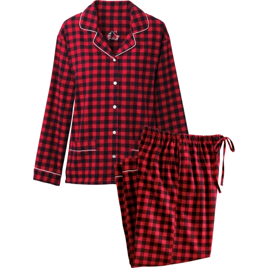 Nothing says cozy like these all-cotton flannel pajamas! The top has a full button front with two patch pockets in an easy, classic style. The matching bottoms have an all-around elastic waist with a drawstring and side-seam pockets. Both the top and bottoms have a relaxed fit and are finished with satiny piping.