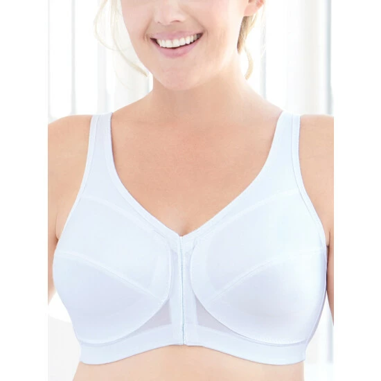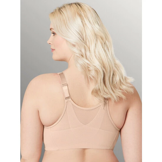 The posture back is crisscrossed with cotton/Lycra® bands designed for comfortable all-day support. The front of the bra has seamed full cups with supportive inner slings and a crisscross design that lifts, supports, and shapes. Extra-wide straps adjust in the back. Convenient front hook-and-eye closure.