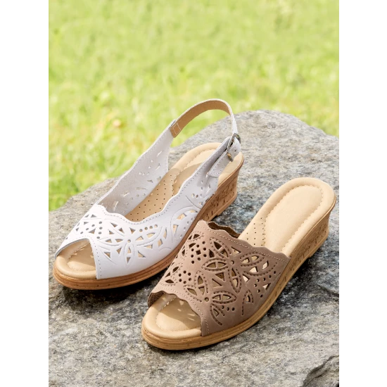 These casual sandals bring the pretty look of cutwork leather and the easy style of a classic slingback sandal to your warm-weather wardrobe. They also feature fully padded memory foam insoles for all-day comfort, lightweight construction, decorative cut-outs for increased breathability, and an adjustable buckle for the perfect fit.