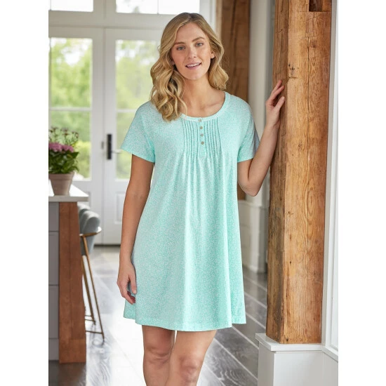 A serene botanical pattern of petite white leaves against a fresh green background is just what you need to relax and settle in for a good night’s sleep. The nightgown is a shorter length for cooler sleeping and features pintucks and rickrack trim. It’s designed with an easy pullover style in soft and smooth cotton knit.